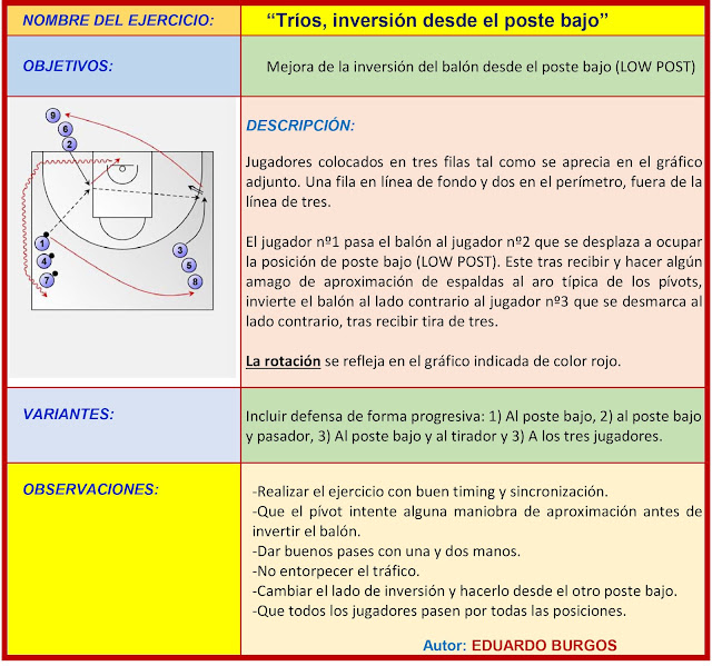 Comienza el ejercicio con un pase interior del jugador nº1 al jugador nº2 situado en posición de poste medio o bajo, este al recibir hará de pívot distribuidor e invertirá el balón al alero contrario para que reciba el jugador nº3, que se podrá desmarcar a un lado u otro para tirar de tres.